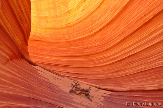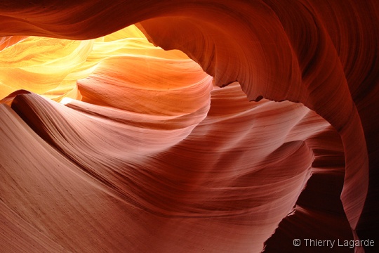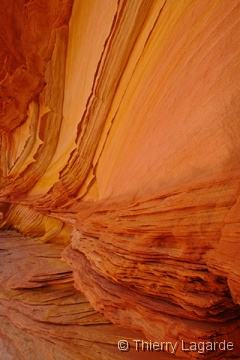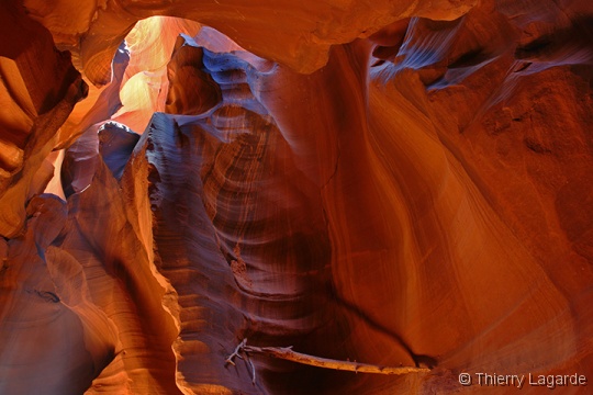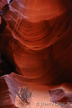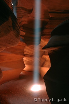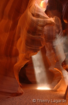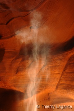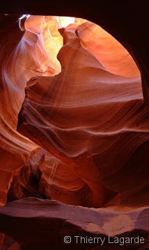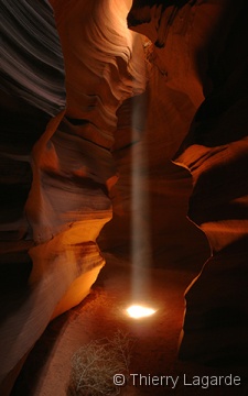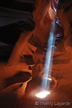 Après deux jours bien remplis, une grasse matinée et un lever à 8H ne fait pas de mal !!! La première étape sera d’aller à l’aéroport pour se renseigner sur les possibilités de survol de Glen Canyon et du lac powell. La réservation est prise pour le lendemain matin 7H30. Je n’avais rien prévu d’autre que Horse Shoe Bend le matin mais en voyant ce beau soleil, je fais part à Lysiane de mon intention de retourner dans Upper Antelope Canyon. Ayant déjà vu 2 fois l’endroit, Lysiane goute à un instant de repos mérité dans le transat chez bob pendant que de mon côté, j’espère en prendre plein les mirettes dans Antelope Canyon. J’y croise un autre Français qui était rentré en contact avec moi grâce au site et comme d’habitude des hordes d’allemands bardés de Canon EOS5D et de trépied de minimum 5kg. Vu mes expériences passées dans le Canyon et la foule qui y règne, je me demande si je ne fais pas la visite de trop. Une fois sur place, mes doutes s’estompent car malgré la foule, je prends mon pied et la moisson de photos sera exceptionnelle. |