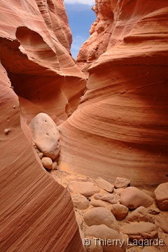 En ce premier jour à Page, les prévisions météo entrevues la veille ne sont pas terribles et dans ces cas là, le plan B s’appelle slot canyon (à condition bien sûr qu’il n’y ait pas d’orage). Le début de la matinée étant ensoleillé, direction Lower Antelope Canyon vers 8H pour bénéficier d’une lumière acceptable. Le guide Navajo trouve qu’il est encore trop tôt à son gout mais devant mon insistance, il daigne se bouger pour nous accompagner sur le début du canyon (obligatoire depuis la tragédie de 1997). L’endroit vaut largement le détour surtout à cette heure avec une belle lumière réfléchie et quasiment personne dans le canyon. La moisson photo sera abondante et de qualité. Au final, on aura pas vu passer les 2H dans le canyon à la recherche des meilleurs angles pour le plaisir des yeux et de l’objectif. |