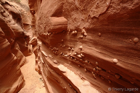 En allant vers l’ouest, on arrive vite sous le pont à l’endroit où une carcasse de voiture est encastrée dans le wash. A cet endroit les Narrows sont particuliers avec des parois incustrées de cailloux sphériques qui font penser à des boutons. On ne le sait pas encore mais les 3 gouttes de pluies recueillies dans le canyon seront les seules du voyage signe annonciateur d’un été sec. |