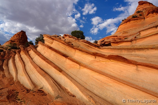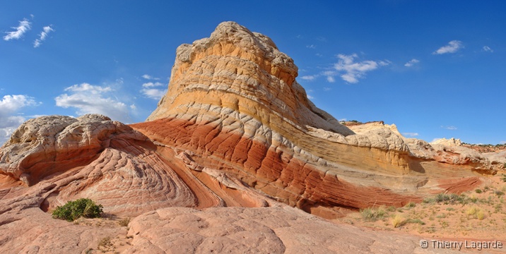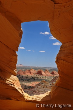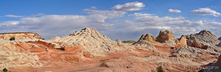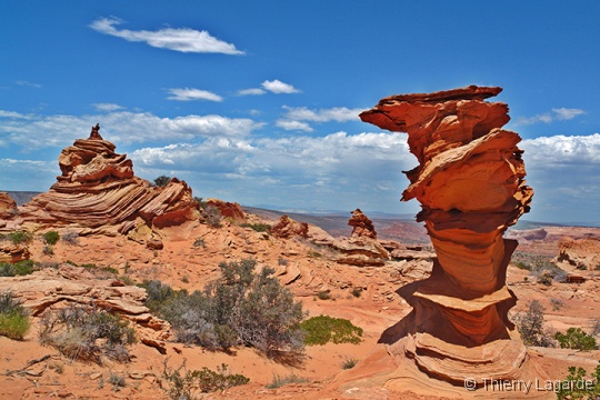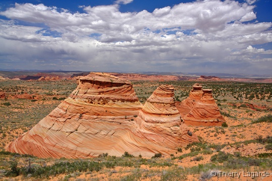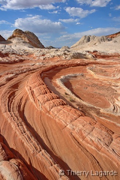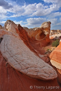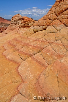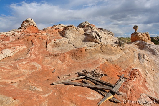 Direction la Section de Cottonwood dans Coyote Buttes south sous un ciel dégagé pour le moment. Nous y passerons environ 4 heures, incluant le pique nique, à explorer l’endroit que Lysiane adore d’emblée. Anecdote amusante, j’ai retrouvé au même endroit la pointe de flèche indienne que j’avais trouvée en 2006. |
