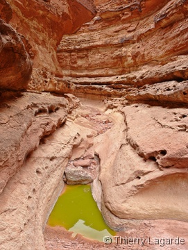 Après un bon déjeuner au Stromboli, je change mes plans pour l’après midi. J’avais prévu initialement de terminer la journée par Paw Hole dans Coyote Buttes south mais sans lumière, le jeu n’en vaut pas la chandelle. On reste donc axés sur les wash et ce sera donc Cathedral wash jusqu’au Colorado cette fois ci (pas comme en 2006). C’est une de mes ballades préférées et à ma grande surprise, Lysiane y prend plaisir. Il est vrai que c’est assez ludique de trouver le meilleur (voire le seul) chemin où passer. Au bout du wash, c’est la claque avec le Colorado et ses rapides qui vous sautent à la figure. Dommage que le temps est pourri mais ce sera un prétexte pour la refaire dans le futur. |