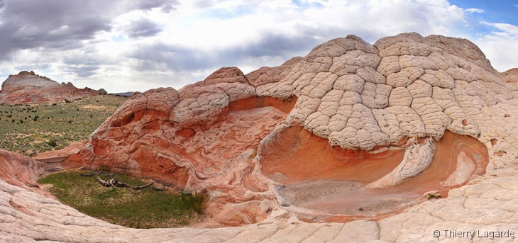 Vers le milieu de l’après midi, direction White Pockets où j’ai prévu de rester jusqu’au coucher du soleil mais le projet est un peu compromis car le ciel s’est maintenant bien couvert. La piste est tout de même assez difficile et je ne regrette pas de ne pas avoir pris le risque de m’y aventurer seul en cette saison. Arrivés sur place, nous ne sommes pas seuls car pas moins de 3 véhicules sont garés. C’est le dernier endroit à la mode et j’espère que le BLM va rapidement limiter l’accès par un système de permis. |