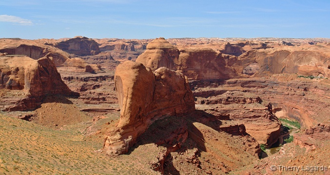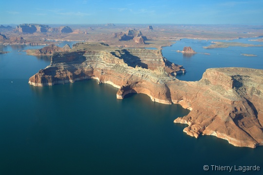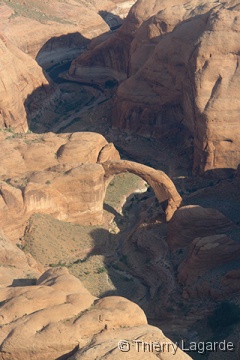 Au réveil de ce jour que j’imagine déjà comme fabuleux, ma première préoccupation est de vérifier le ciel car pour qu’un vol au-dessus du Southwest soit réussi, ll faut que la météo soit de la partie et comme souvent tôt le matin, le ciel est dégagé. Direction donc l’aéroport (j’appelle plutôt cela un aérodrome) de Page pour ce survol de Glen Canyon. L’avantage de voler tôt le matin est d’une part de limiter les turbulences et d’autre part de bénéficier d’une lumière acceptable. Nous attendions beaucoup de ce vol et le résultat est au-delà ce nos espérances car même si nous savions que Glen Canyon est un des plus beaux joyaux de l’Ouest (nous aurions aimé pourvoir arpenter quelque uns de ces canyons avant que le barrage ne soit construit…), je ne m’attendais pas à un spectacle aussi grandiose avec ce dédale de Canyons dans ces eaux qui vont du bleu azur au vert et en prime le survol de Rainbow Bridge et Horseshoe bend. |
