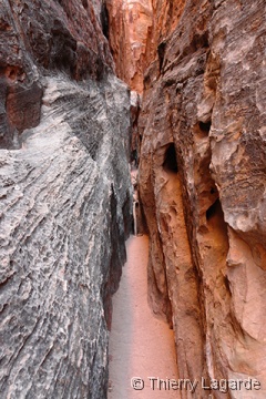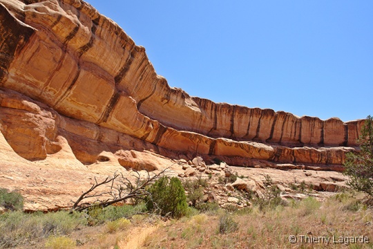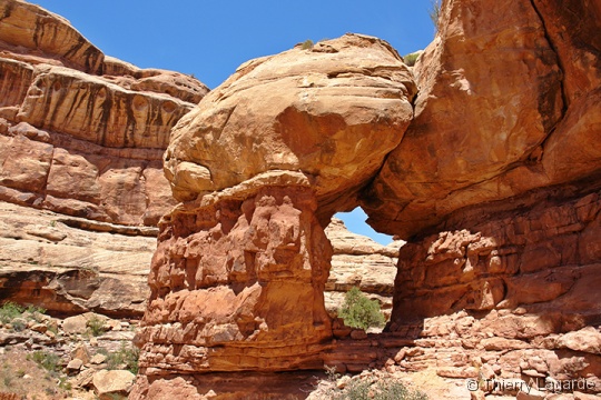Initialement j’avais prévu pour cette journée une ballade dans Grand Gulch (Kane gulch ranger station to jonction ruins) et une ballade dans Stair Canyon. La température de 40°C me fera réviser mes plans à la baisse. Le plan B de la matinée s’appelle donc Collins Canyon pour aller jusqu’aux Narrows de ce canyon situé dans Grand Gulch. Route donc vers le trailhead situé au bout de 6,5 miles de piste très roulante au début mais très vite constituée de portions de slickrock et très cassante. Arrivés au trailhead, pas un chat comme d’Habitude et nous voici en route après avoir signé le registre qui n’a pas vu âme qui vive depuis 2 semaines. Le chemin n’est pas toujours évident à suivre mais avec les indications on ne se perdra pas et au bout d’environ 1h15 nous voici arrivés dans les Narrows que l’on traversera sans s’en rendre compte. En effet, je n’avais pas bien lu sur le bouquin mais la section fait moins de 10m de long….C’est donc plutôt un rétrécissement ponctuel que des Narrows comme on a l’habitude d’en voir et le reste de la ballade est supérieur à cette portion sans intérêt. |