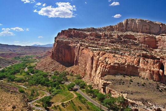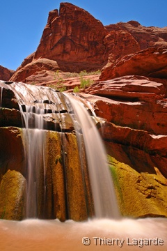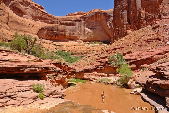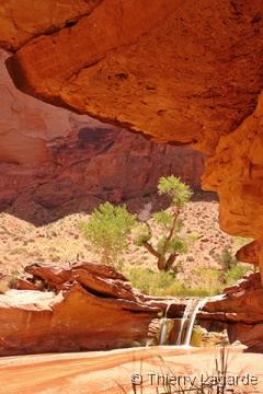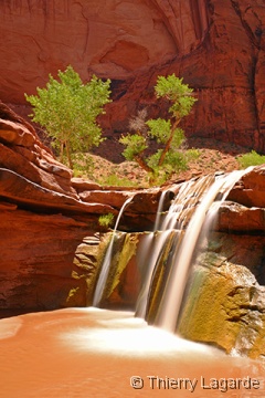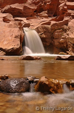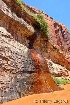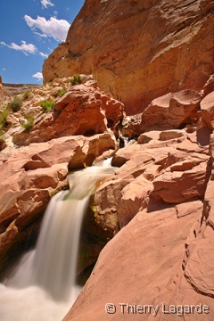 Après un pique nique à Hog Spring, route vers Capitol Reef. Lysiane, toujours à l’affût d’un point d’eau repère le long de l’US24 une cascade qui se jète dans la Fremont River. C’est l’occasion de faire une petite halte pour aller se rafraichir dans l’eau et faire quelques belles photos au passage. Comme toujours l’eau attire les foules et l’endroit devient vite surpeuplé. |