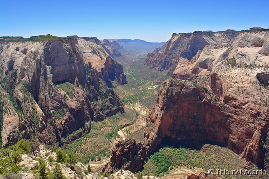 Zion est un des parcs que l’on n'a jamais exploré en profondeur et ce voyage donnait l’occasion d’y passer le temps nécessaire. Route donc vers Zion en cette matinée ensoleillée où les 40° sont encore prévus. Pour Commencer, j’avais trouvé une randonnée peu connue dans Zion et donc peu fréquentée qui permet d’aller à Observation Point sans trop se fatiguer : East Mesa Trail. Sur la route puis piste qui y mène, je suis même étonné du peu d’indications pour une randonnée située dans l’enceinte du parc. A part quelques panneaux indiquant ‘Observation Point’ rien du tout et même pas de trailhead au bout de piste qui laisserait penser à la limite qu’on n’est pas sur le bon chemin (merci le GPS dans ces cas là). Après le pique nique d’usage (l’endroit ne s’y prête pas vraiment), en route vers Observation point. Le profil de la rando est sans difficulté et on respire à pleins poumons les bonnes odeurs de pins. En 1H15, nous voilà au point de vue qui est époustouflant : même d’ici Angel’s landing paraît tout petit à quelques centaines de mètres en dessous de nous. |