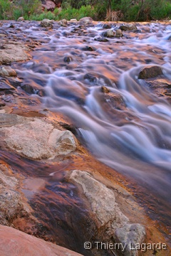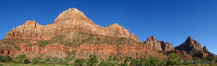 Après de longues minutes de contemplation, retour vers la voiture et route vers le Canyon de Zion avec pause photo au passage au pied de Checkerboard Mesa. Après avoir pris la chambre au El Rio Lodge et fait quelques courses on choisit de terminer la journée au bord de la Virgin River le long de Parrus trail et en profiter pour se rafraîchir tant la chaleur est torride même en cette fin d’après midi. De retour à l’hôtel, je n’arrive pas à remettre la main sur mon couteau suisse qui fait office de tire-bouchon pour ouvrir la bouteille de vin pour l’apéritif. Tant pis, je massacre le bouchon avec une lame de couteau de ma pince multifonction. Du coup, en plus de boire du vin au liège, on est contraint de s’enfiler la bouteille entière. Heureusement que les vins sont en général léger et qu’on ne va pas gravir Angel’s Landing derrière…