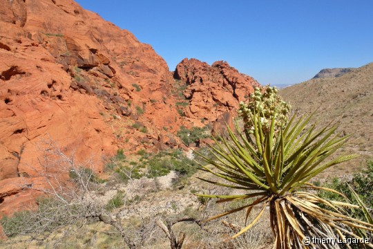 Après une nuit à 2m de l’autoroute (on avait l’impression que les camions roulaient dans la chambre), lever matinal comme toujours le premier jour et route vers Red Rock, premier site sur notre longue liste. Pour commencer soft ce sera la randonnée de Keystone Thrust. Il fait déjà très chaud mais il y pas mal de vent ce qui rend la température beaucoup plus supportable. La rando n’est pas géniale et on ne voit pas vraiment où est la fin avec d’ailleurs plusieurs passages casse gueule. |