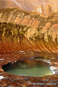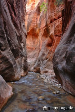 140 photos plus tard, retour à Hurricane pour prendre steeve et partir pour Left Fork of North creek. Nous sommes au trailhead vers 9h30 et c’est le départ vers cet endroit magique qu’est le Subway. Après environ 1 mile sur le plat, une descente très raide (c'est casse patte au retour) permet d'accéder assez rapidement au fond du Canyon. A partir de là, il n'y a pas vraiment de chemin et on alterne entre sentier et marche dans l'eau. Pour ne pas perdre trop de temps, je décide rapidement de marcher dans l’eau ce que ne font pas Lysiane et Steeve qui s’y résigneront peu de temps après moi. Qui plus est la marche dans l’eau est très fun (faire attention aux serpents d'eau, aperçus à 2 reprises...). Le chemin n'est pas de tout repos, cassant, parfois un peu acrobatique et autant dire que la progression est plutôt lente. Après 3H, nous arrivons aux premières terrasses et Cascades où je me vautre en grimpant sur une terrasse en train de filmer. C’est en effet très glissant et il faudra faire attention en descendant. |