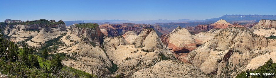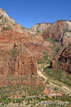 C’est l’endroit idéal pour le pique nique au bord de la rim. Après la pause, on entame la première descente de 500m de dénivelé et c’est la première fois que je ressens une douleur sous le pied gauche. J’ignore si c’est l’échauffement ou une boule nerf, toujours est il que c’est très douloureux et m’oblige à m’arrêter pour refroidir le pied avec un freezpack, ce qui calme la douleur pendant 2 ou 3km. Nouvelle montée un peu casse patte à ce moment déjà avancé de la randonnée avant de redescendre ensuite vers Scout Lookout et la partie Finale de Angel's Landing que je ne ferai pas comme en 2007 car mon pied me fait vivre un calvaire. Et dire qu’il reste encore 3.5km… |
