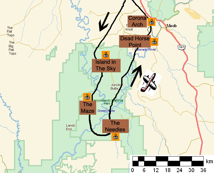 Commentaires: Si vous séjournez à Moab et que vous avez apprécié la visite terrestre de Canyonlands ou d'autres sites de l'ouest comme Monument Valley, un survol vous permettra de redécouvrir ces endroits extraordinaires et d'admirer des sites qui sont difficilement accessibles à partir du plancher des vaches. La compagnie Slickrock Air Guides basée à l'aéroport de Canyonlands (20 miles au nord ouest de Moab par l'US 191), propose plusieurs formules dont un survol de Canyonlands en 1h A/R et un tour plus complet d'environ 3h A/R. J'ai moi-même testé la première formule en 2004 et la deuxième en 2006 tant le vol effectué en 2004 m'avait laissé un souvenir impérissable. En effet, survoler Canyonlands vous donnera un autre aperçu de l'extraordinaire diversité du parc et vous permettra notamment, en plus de Island in the Sky et The Needles de survoler The Maze, la partie la plus inaccessible et inhospitalière du parc.