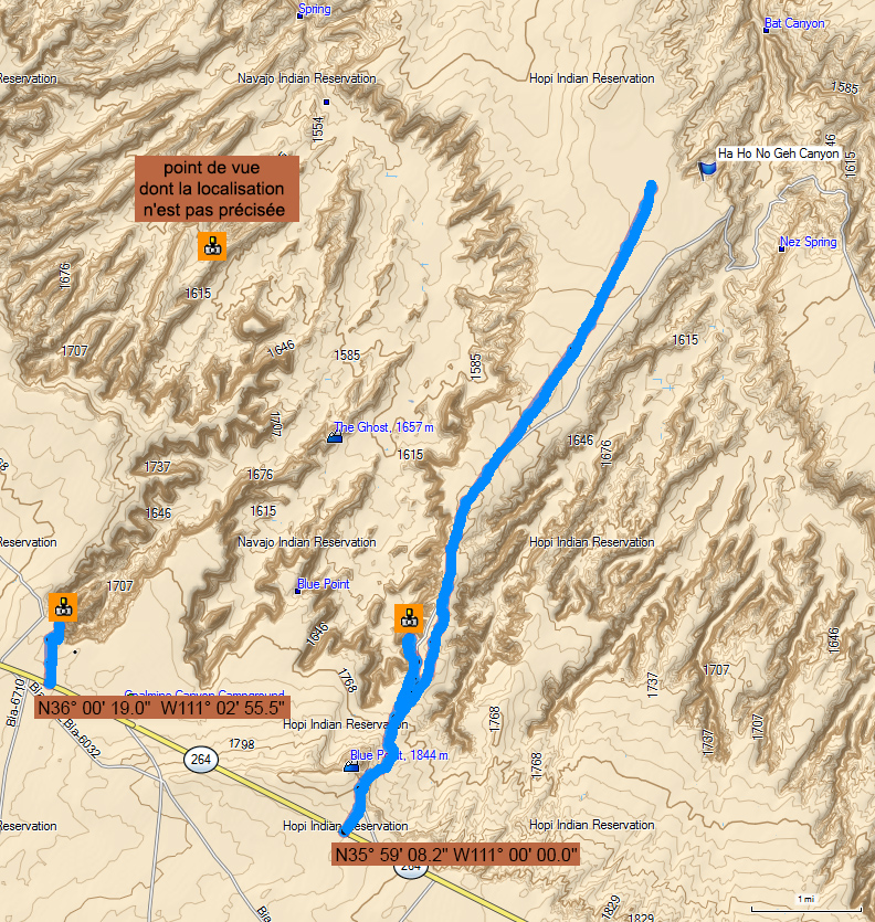 Situation: la piste la plus à l'ouest sur la carte qui mène à la rim de Coal mine en 0.6 miles est située à 15.1 miles de Tuba City sur la 264 tandis que la piste la plus à l'est sur la carte qui longe les deux rim est située à 18.2 miles de Tuba City.
