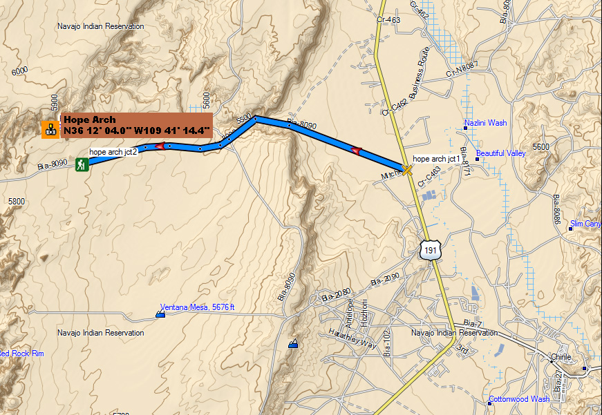 Situation: à partie de la jonction entre la 191 et l'indian 7 qui vient de chinle, faites environ 2.3 miles vers le nord sur la 191 et prendre une piste à gauche (qui ressemble plus une à route non carossée) qui part vers l'ouest. après environ 5 miles sur la piste on peut apercevoir vers le Nord Hope arch mais elle n'est pas faicle à voir car on la voit par la tranche et non de face. Une piste très sabloneuse mène quasiment au pied de l'arche mais pour notre part nous nous sommes garés sur le côté de la piste principale à hauteur du pylone électrique et de là il suffit de suivre nord/nord ouest vers l'arche qui est située à environ 1km de la piste. De Chinle il faut compter une vingtaine de minutes maximum pour arriver au point de "parking".