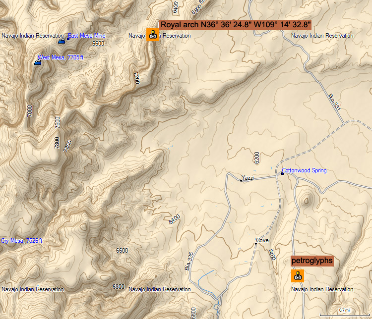 Commentaires: Je suis un grand amateur d'arches et j'ai attendu 2015 pour découvrir Royal arch (appelée aussi Cove arch) qui était sur ma wish list depuis longtemps mais qui nécessite non seulement un véhicule à très haute garde au sol mais également s'être accompagné par un Navajo car cette arche est située dans la réserve Navajo. En 2015 nous avions dormi au Sage Hill B&B qui propose seulement quelques nuitées par an aux touristes de passage (ils ne cherchent pas la publicité donc inutile de s'y ruer) et Timothy le patriarche Navajo de plus de 80ans nous avait emmené à Royal arch dans son pick up. outre la difficulté de la piste et le fait qu'elle soit en territoire Navajo, la végétation est dense donc si vous tentez de vous y rendre avec votre véhicule vous ruinerez la carrosserie à voir les dizaines de rayures qu'il y avait sur le pick up à notre retour... De la piste l'arche est environ à 1mile de marche vers l'ouest et il est possible de l'admirer des deux côtés. Les photos dans l'album ont été prise au pire moment de la journée, vers 13h et face au soleil. Cette arche est très impressionnante car très haute et très fine et elle est également visible de la route donc vous pouvez l'apprécier avec de bonne jumelles même si vous n'allez pas sur place. Dans le coin de Sage Hill, il y a également de beaux panels de pétroglyphs que nous étions allés voir avec nos guides d'un jour, Timothy et sa femme Karen. l'icône sur la carte n'indique absolument pas l'endroit où se trouvent ces petroglyphs