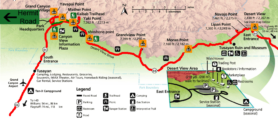 Situation: entrée est du Grand Canyon, la route 64 dessert les principaux points de vue accessible avec un véhicule particulier. Pour accéder à Yaki point et South Kaibab Trailhead, il est nécessaire de prendre une navette à partir de Canyon View Information Plaza