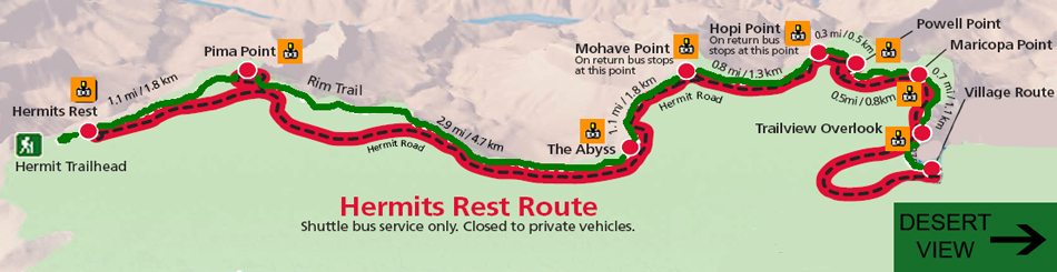 Conseils: Si vous n'avez que très peu de temps à consacrer, contentez vous de la ballade le long de la rim sur la Hermit Rest Road qui dessert de nombreux points de vue. Si vous consacrez par contre deux jours à la visite vous pourrez descendre au fond du canyon (pour les personnes qui sont très bon marcheurs avec une bonne condition physique) ou faire plusieurs randonnées comme 'South Kaibab trail to cedar ridge' ou 'Hermit Rest to Dripping spring' par exemple. En complétant la visite par quelques points de vue au lever de soleil et coucher de soleil vous aurez ainsi une bonne approche du Grand Canyon.