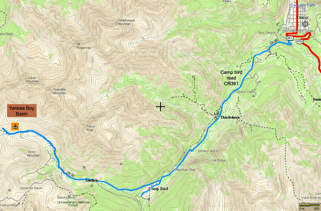 Yankee boy Basin est une destination très prisée au départ de Ouray car permet d’observer le long de la piste (Camp Bird Road accessible à la sortie sud de la ville) des torrents, de petites cascades et jardins suspendus, quelques mines abandonnées, de belles montagnes aux teintes aurifères, Twin Falls, une double cascade très impressionnante au débit maximum à la fonte des neige et enfin des champs entiers de fleurs sauvages observables en général en nombre à partir de mi-juillet. Lorsque les chutes de neiges ont été importantes en hiver il n’est pas rare qu’il y ait encore beaucoup de neige au début de l’été, ce qui peut rendre la piste impraticable. Il est nécessaire de disposer d’un véhicule 4*4 avec une bonne garde au sol et si possible une boite courte pour s’aventurer sur cette piste. Pour ceux qui n’en possèdent pas, de nombreux guides proposent à Ouray des excursions à la demi-journée qui sont suffisantes pour découvrir les lieux en prenant son temps. |