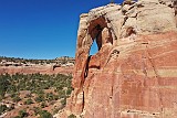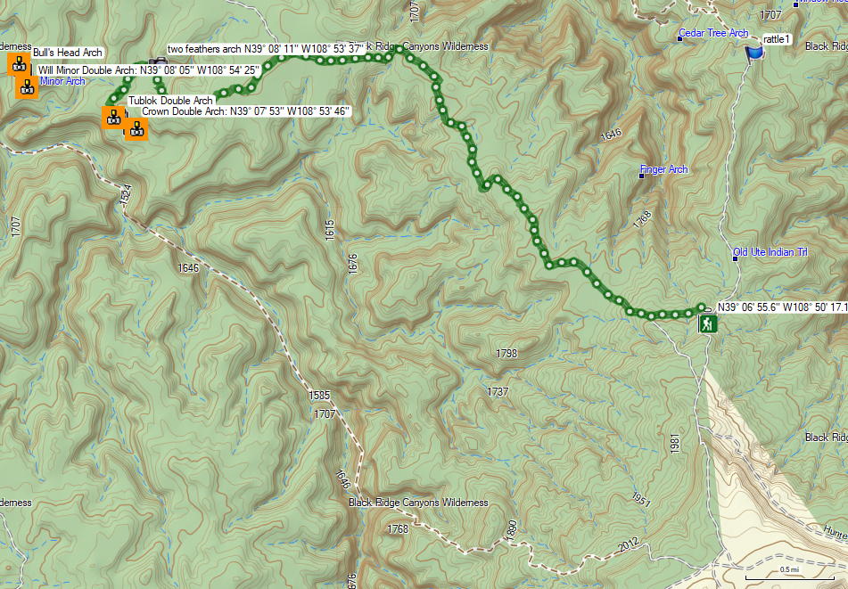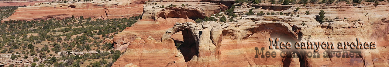 Commentaires: L’accès à Mee canyon se fait par la même piste que rattlesnake canyon à savoir Lower ou Upper Black Ridge road mais là le trailhead est situé 2 miles environ avant celui de Rattlesnake canyon. Il ne s’agit pas du trailhead de mee canyon mais d’un trailhead non officiel pour raccourcir le parcours à pied. Il faut suivre pendant environ 3,4 miles une ancienne piste et prendre ensuite vers ouest/sud ouest pendant environ 0,9 miles jusqu’à arriver à la RIM. Il n’y a pas de sentier à proprement parler pour descendre une quarantaine de mètres plus bas et c’est assez scabreux mais il n’y a pas d’autre choix si vous voulez explorer les arches. De la rim on aperçoit assez bien two feathers arch au Nord / Nord ouest. Pour aller au pied de Tublok et Double crown, une très jolie arche double, il faut contourner par l’ouest la péninsule et repiquer à l’est. Plus au loin Ouest/Nord ouest, il y a sans doute la plus belle arche du coin : Will Minor combinaison d’une arche verticale et horizontale (rappelant celle dans rattlesnake canyon). De l’autre côté du canyon, plein sud se trouve Bulwark arch qui n’est pas accessible via ce trail. la randonnée fait environ 20km aller et retour donc prévoir la journée pour explorer le coin.
