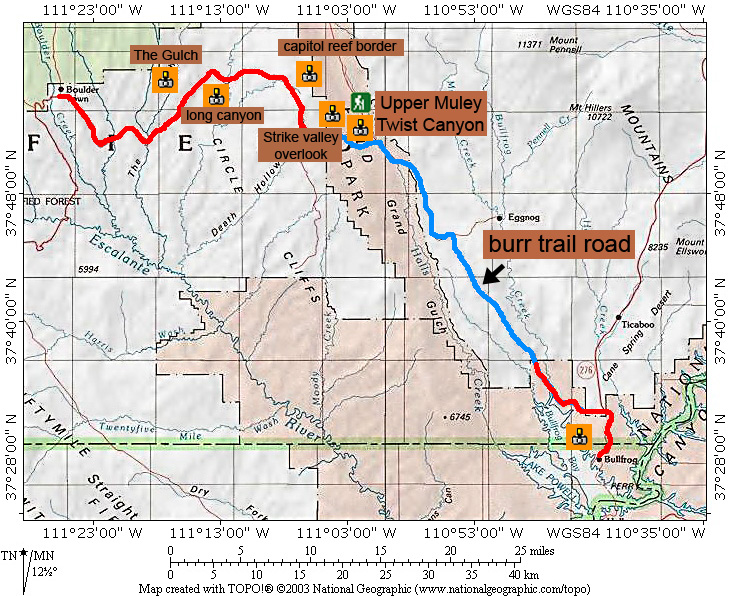 Commentaires: La burr trail road est sans doute la plus belle des routes/piste de l'ouest américain. Reliant boulder à la marina de bullfrog sur le lac powell en traversant capitol reef et grand staircase national monument, cette route de 66 miles offre des paysages extraordinaires. tout à tour, vous découvrirez long canyon, The Gulch, le waterpocket fold (à ne manquer sous aucun pretexte), les henry mountains et glen canyon.