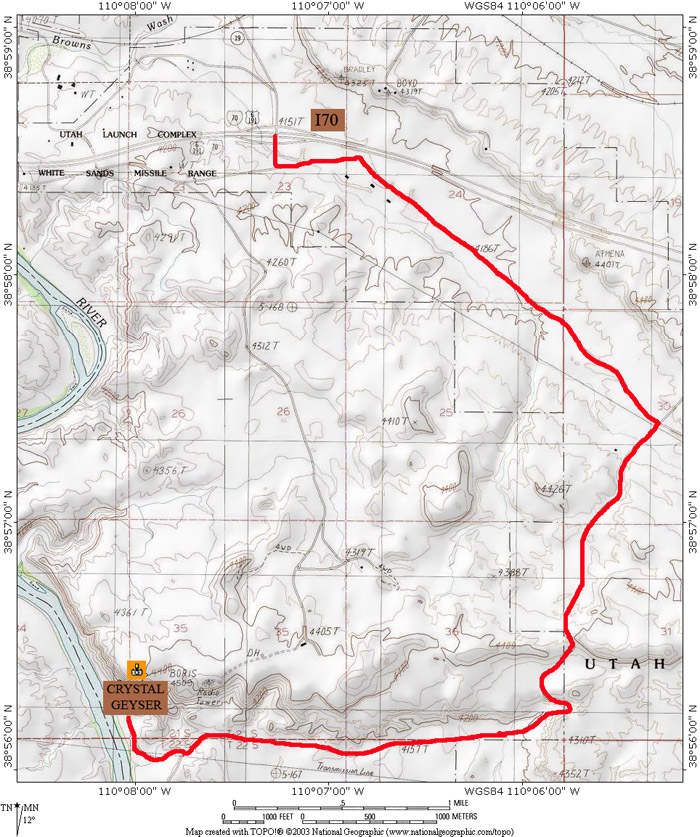 Situation: Prendre l'I70 vers l'est. après avoir passer green river, vous traverserez le pont qui enjambe la green river. A partir de ce moment, la sortie se trouve à 1.3 miles. prenez cette sortie et prenez la première route à droite. après 0.1 mile, prenez à gauche la route qui longe l'autoroute. roulez pendant 2.2 miles jusqu'à une intersection où vous prendrez à droite. continuez ainsi pendant 4 miles pour arriver au geyser.