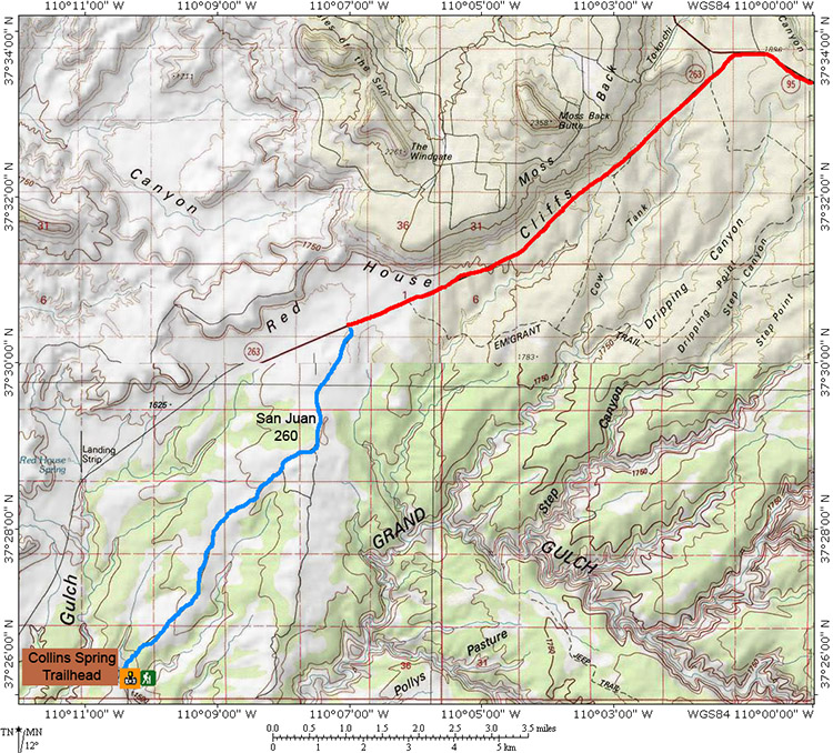 Situation: A partir de la jonction entre la route 95 et 276 (notée ci dessous 263 sur la carte) située à 83.8 miles sud est de Hanksville ou 34.9 miles de l'indication pour la Marina de Hite sur la route 95, prendre la route 276 vers le sud ouest pendant 6.7 miles. Vous appercevrez alors la piste San Juan 260 à gauche que vous emprunterez. Après 2.4 miles, prendre à droite à une jonction. Après 4.4 miles et pendant les 2.1 miles qui suivent, vous aurez droit à une portion de Slickrock assez cassantes qui impose de conduire à allure très modérée. Vous atteindrez finalement le trailhead 6.5 miles après avoir quitté la route 276.