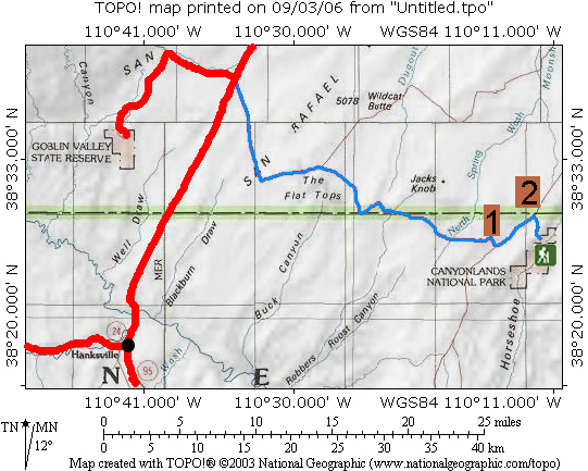 Situation: Si vous venez de Green River sur la route US24, 0.5 après la jonction qui mène à Goblin valley, prendre la piste sur la gauche (panneau indicatif). Si vous venez de Hanksville, comptez environ 19 miles avant d'apercevoir le panneau qui indique la piste sur la droite. Suite ensuite la piste pendant 24.2 miles jusqu'à un embranchement (point 1 sur carte ci dessous) que vous prendrez vers la gauche. 5.1 miles plus loin, vous verrez un panneau indiquant Horseshoe Canyon sur la droite (point 2 sur la carte). Prenez cette piste pendant environ 1.8 miles jusqu'au parking.
