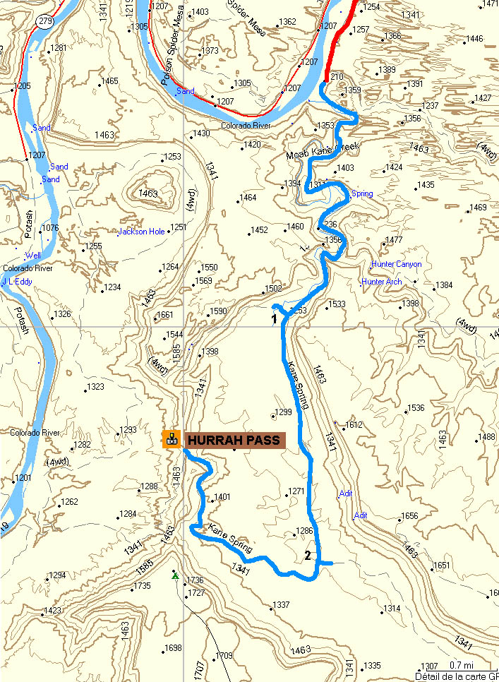 Situation: A partir de main street à Moab (vers le nord ouest) prendre le kane creek bld sur la gauche pendant 4.5 miles. prendre ensuite la piste (en bleu sur la carte) pendant 4.3 miles jusqu'au point 1 où vous prendrez la kane creek road pendant 5.5 miles jusqu'au point 2 où vous prendrez sur la gauche la hurrah pass road pendant 3 miles