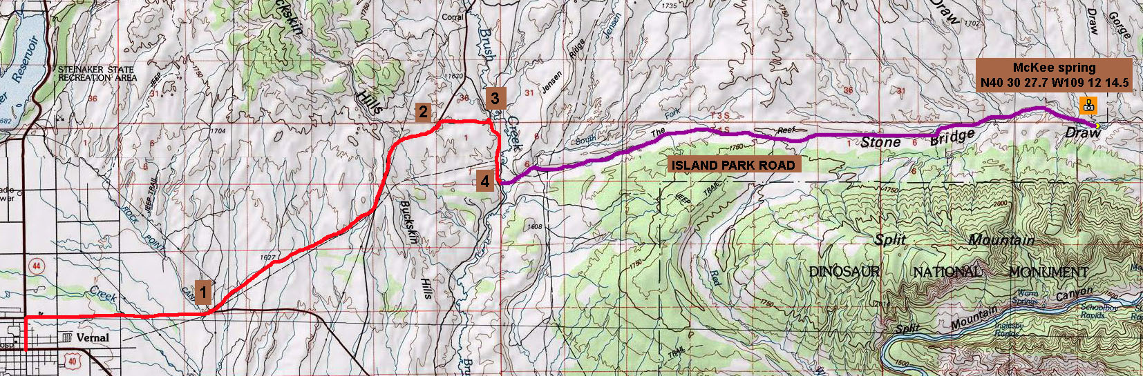 Situation: Quitter vernal par l'est: à environ 2.9 miles du centre, laisser la brush creek road sur la droite (1) et prendre la jones jones hole road. à environ 7.8 miles (2), prendre la route qui part sur la droite  pendant 1 mile. prendre alors à droite à la bifurcation en T (3) pendant 1.1 mile. prendre alors à gauche (4) la island park road: Les petroglyphs sont situés à environ 11 miles (voir point GPS)