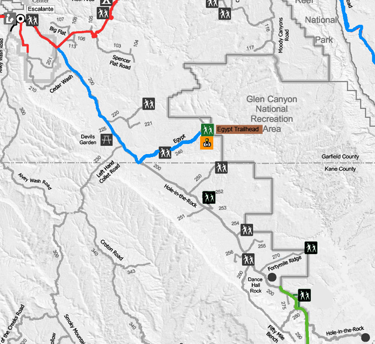 Situation: Prendre la Hole in the Rock road pendant environ 16.2 miles jusqu'au paneau qui indique Egypt vers la gauche. Prendre cette piste jusqu'au boût (environ 10 miles jusqu'à Egypt trailhead). Attention, plusieurs sections sont très cassantes ou piégeuses donc un bon véhicule 4*4 est nécessaire.