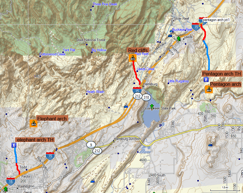 Situation: pour la partie principale, à partir de l'I15 en venant de Saint George, prendre la sortie 16 vers l'UT9 (7 miles au nord de St George). Après 1 mile, prendre la route 91 qui longe l'autoroute pendant 4 miles. Vous verrez alors un panneau indiquant "Red Cliffs". Empruntez alors cette route qui passe dans un tunnel sous l'I15 qui vous mènera au parc en quelques minutes. les chemins d'accès aux deux arches sont décrites dans les pages dédiées à ces arches accessibles en cliquant sur les icones photos sur la carte ci dessous.