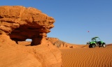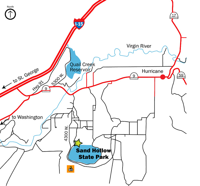 Commentaires: Entre Saint George et Zion, Sand Hollow Reservoir est un endroit prisé des locaux qui viennent naviguer sur le plan d'eau le week end et faire du quad ou du buggy dans les dunes. Au delà de l'intérêt de pouvoir faire de belles photos en toute fin de journée avec des reflexions de red rocks dans l'eau, il y a de belles étendues et dunes de sable dès que l'on s'éloigne du plan d'eau vers le Sud. Dans notre cas, nous avions à disposition un petit buggy prété par un ami sur place donc idéeal pour explorer l'endroit. En l'absence de véhicule motorisé, il est plus pénible de marcher dans le sable mou sous la chaleur souvent écrasante dans cette région de l'UTAH. La difficulté indiquée pour la piste ci dessous concerne uniquement ceux qui s'aventurent avec un engin motorisé dans les dunes car l'accès au parc ne pose lui pas de problème.