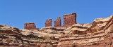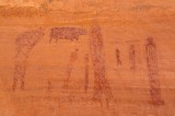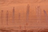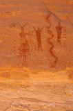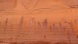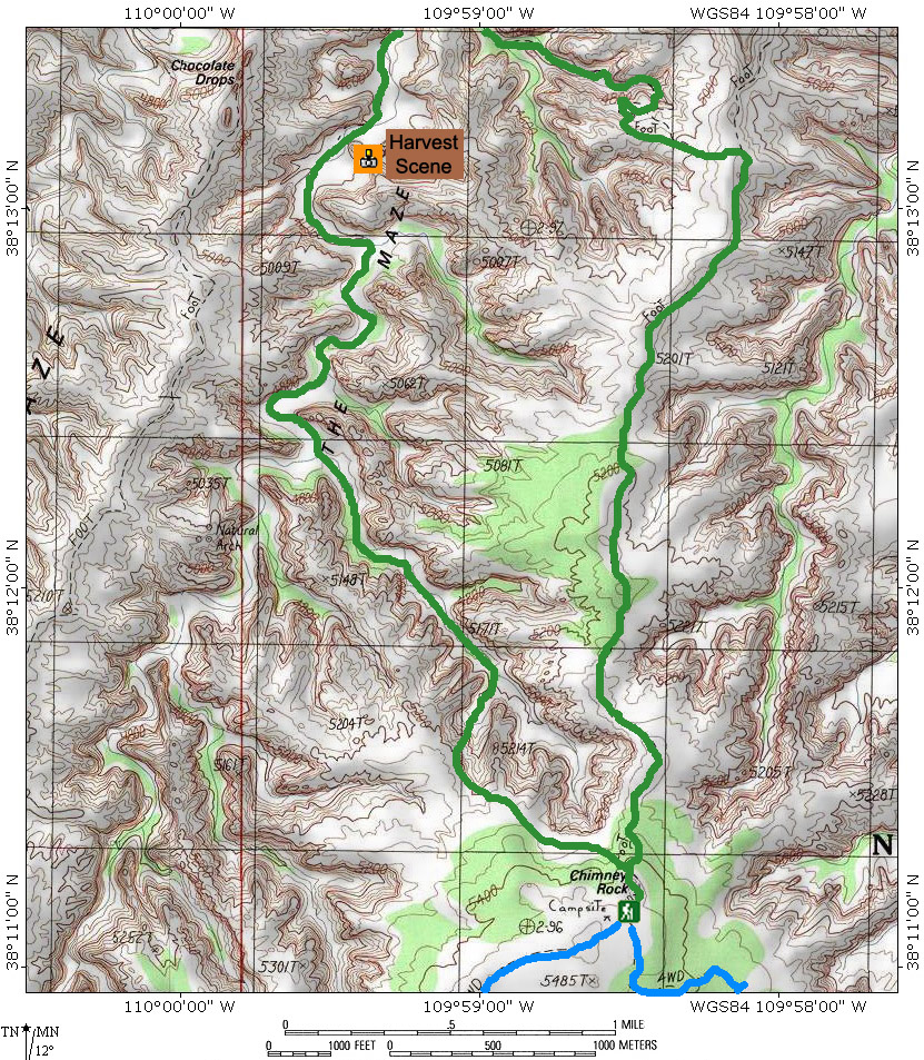 Harvest Scene est un panel de petroglyph exceptionnel mais c’est sans nul doute l’un de ceux qui est le moins visité en raison de son éloignement extrême de toute civilisation. En partant de Chimney Rock, on longue la rim du Canyon pendant une vingtaine de minutes avant de plonger brutalement dans le canyon et se retrouver au fond après environ une bonne heure de marche. Ensuite c’est de la marche dans le wash donc dans le sable jusqu’au Panel (ne pas se tromper à la confluence en continuant vers le Nord). Attention aux deer flies, présentes en été dans le wash -> pantalon conseillé. Au bout d’environ 2h30, on arrive devant Harvest Scene mais aussi les autres panels d’un intérêt moindre. Pour profiter du spectacle, il est impératif de partir suffisamment tôt sous peine d’avoir le panel en plein soleil et ne rien voir du tout, ce qui serait dommage vu les efforts à déployer pour cette randonnée. A l’aller, on a de belles vues sur les Chocolate drops en contre plongée mais impossibilité d’y accéder via ce chemin. N’oubliez pas qu’en été les températures sont souvent très élevées (entre 35 et 40°c), donc prenez de l’eau en grande quantité |