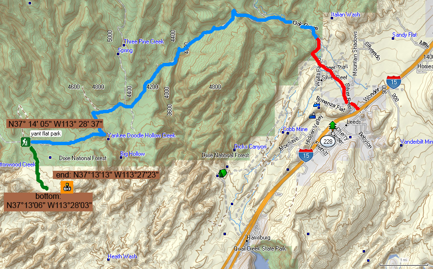 Situation: sur l'interstate 15, en venant par le sud, prendre la sortie 22 et rester sur cette route qui traverse leeds. au bout d'environ 1.5 miles, prendre à gauche et passer sous l'autoroute sur la silver reef road. au bout d'environ 0.7 mile, prendre la oak groove road sur la droite (FR032) qui devient une piste assez roulante. au bout d'environ 2.4 miles, une piste par vers la droite. rester sur la piste doit devant vous qui est la FR031. Vous atteindrez l'ancienne jeep road qui fait office de trailhead et de parking au bout de 10.5 miles après être passé sous le pont de l'autoroute.